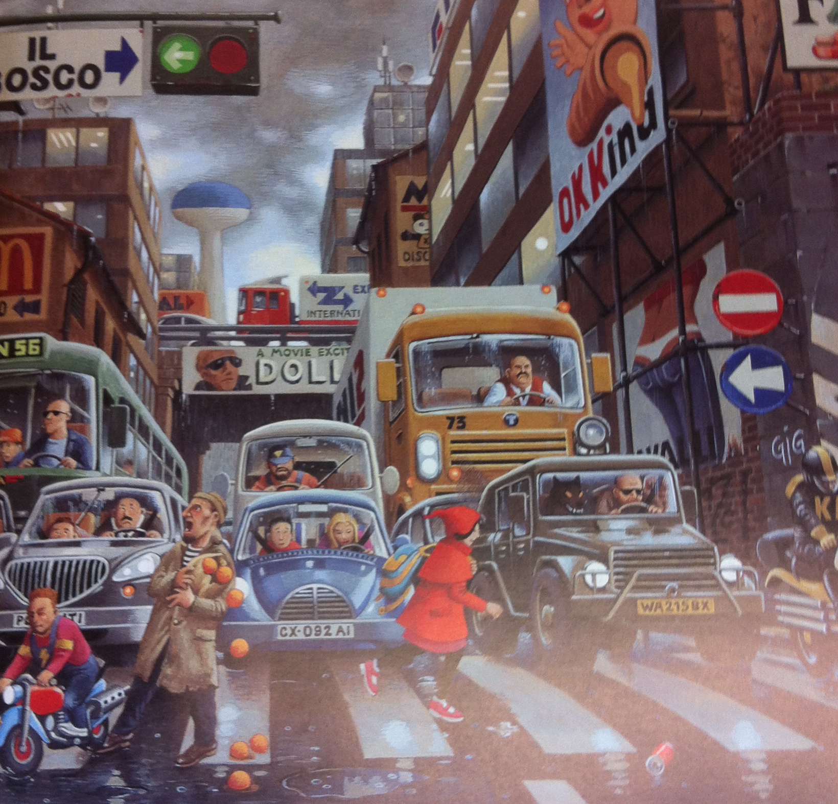 La petite fille en rouge entre en intertextualité avec le conte du Petit Chaperon rouge de Charles Perrault. En effet, ce dernier se déroule dans une forêt, lieu sombre et immense où le petit chaperon rouge se perd et rencontre des dangers. Sophia, quand à elle, progresse dans une ville moderne et inconnue, assimilée à cette forêt par sa taille, sa noirceur et la hauteur des bâtiments. Le danger est lié à l’inconnu dans les deux cas malgré la solitude à travers l’un et la foule à travers l’autre, ainsi qu’aux mauvaises rencontres que l’on peut faire étant jeune. Sophia apparait tout d’abord comme ingénue, naïve du monde extérieur et de ses règles. Ce parcours à travers le magasin nommé "the wood" (le bois en anglais) est une certaine initiation à la vie impitoyable des adultes dans la société actuelle.