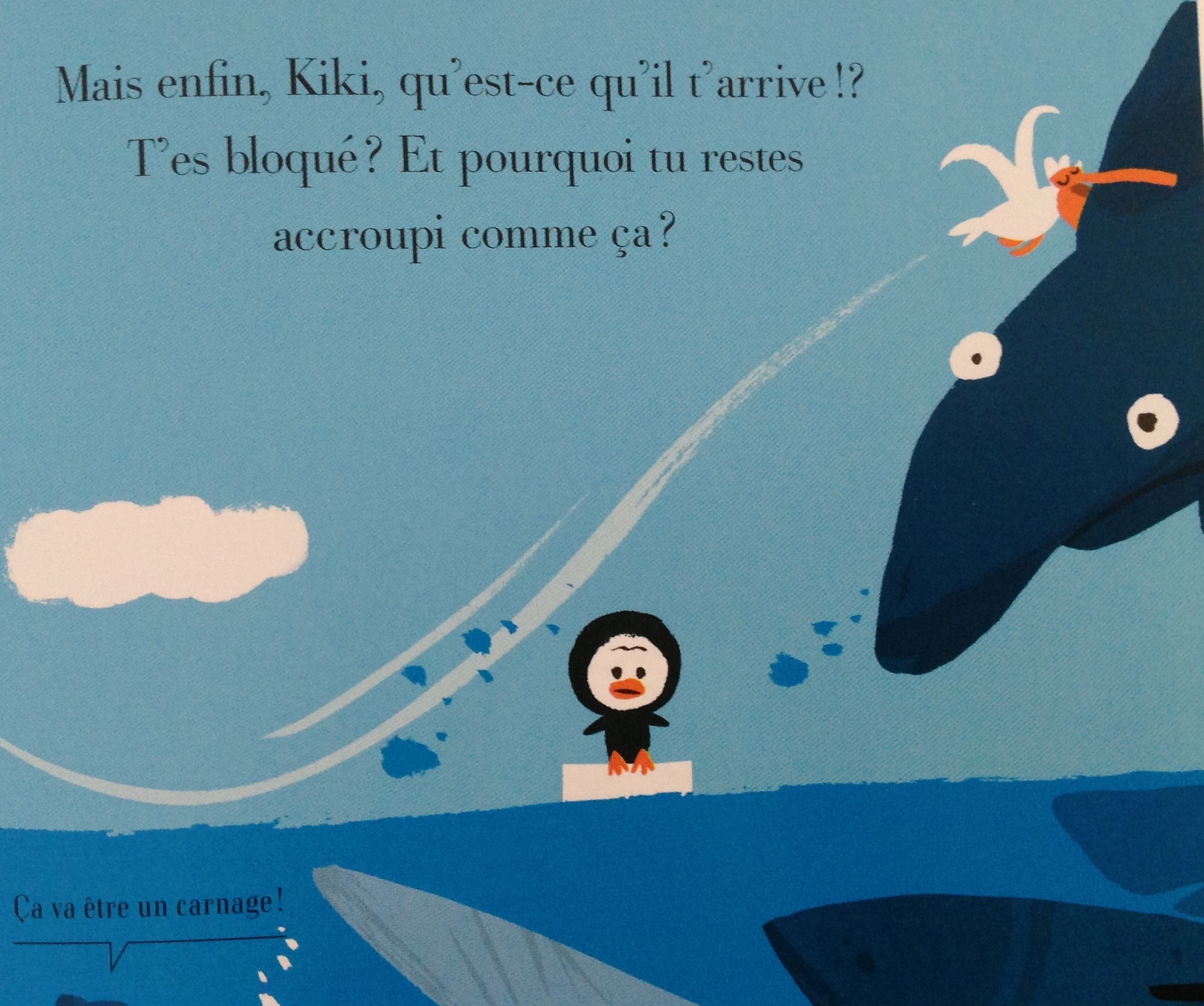 Oui, bon certes, Kiki fait caca ! Mais il s’en passe des choses ! Le petit king de la banquise trône sur son bel océan bleu (un beau bleu canard WC ?). Et là, ça rode autour de lui (on ne peut vraiment pas être tranquille nulle part !). C’est un requin (entre nous, il n’a pas l’air sympa) qui s’avance, puis deux, puis ... Mais Kiki est trop concentré pour s’en émouvoir. Il n’entend même pas les commentaires désopilants des petits poissons... Bon, on te laisse tranquille Kiki !