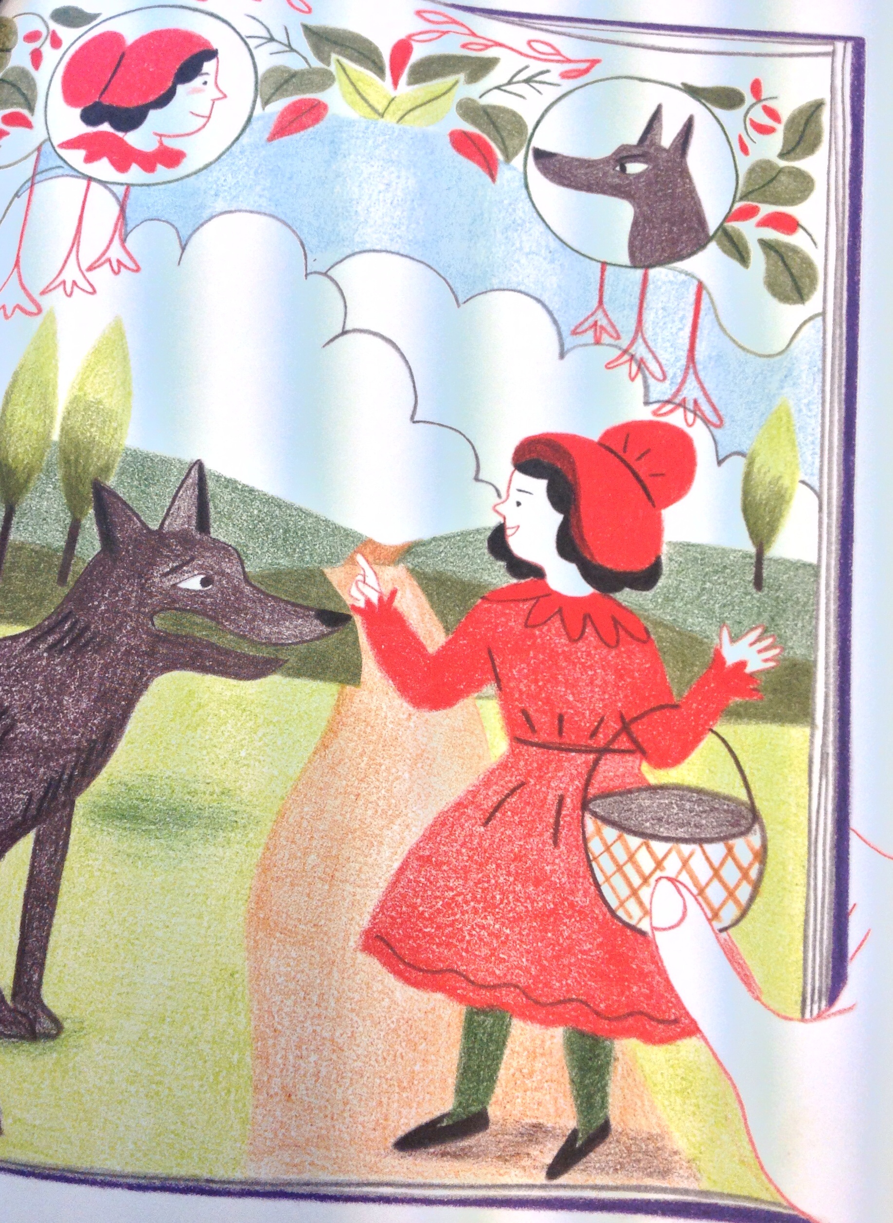 - Le livre : il y a un effet de jeu et de mise en abyme entre le conte initial et cet album, effet marqué par cette main qui nous plonge dans les codes du texte que l’auteur s’est plu à inverser : c’est la petite fille qui est menaçante, c’est le loup qui s’étonne de ce qu’elle a une grande bouche, des grandes oreilles et de grands yeux. Cela peut être l’occasion de discuter avec les élèves sur ce que cela signifie être lecteur .... La mise en abyme est explicite dans certaines illustrations :
